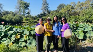 We convened in Loomis, a peaceful farming community north of Sacramento, where our teacher and his wife now live. The farmhouse is nestled among crops and flower gardens, surrounded by tranquil nature. Some of us had visited before, a few even multiple times. Aside from reuniting with our teacher, the highlight was staging a “film shoot” at the sprawling lotus ponds—hundreds of giant blossoms—and capturing the noisy flurry of chickens and ducks across his five-acre farm. The lotus flowers, enormous and fragrant in the fresh air, were irresistible to the girls (dressed in colorful áo bà ba) who rowed a boat to pick blooms—encouraged by a pro videographer in our group.
