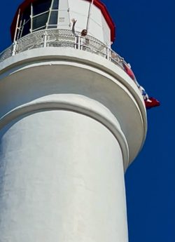 Khi đến chân ngọn hải đăng, hai nàng nhìn lên, nhìn lại rồi đồng loạt… đầu hàng, quyết định ngồi dưới ngắm cảnh và chụp hình. Chỉ còn tôi và ông bạn Hùng quyết chí “thử thách bản thân”. Vậy mà khi đi được nửa chừng, chàng Hùng thở hổn hển, than không đủ oxygen, đành quay xuống – hắn hút thuốc quá đến nỗi nửa lá phổi đã cuốn theo chiều gió rồi. Tôi một mình hì hục leo đủ 135 bậc thang thẳng đứng. Đến đỉnh, mồ hôi chảy ròng ròng, hơi thở phì phò, nghe tiếng chào “Congrats” của anh chàng gác đỉnh cũng chỉ thì thào “thank you” rồi thôi. Bù lại, trước mắt tôi mở ra một cảnh sắc bao la, hùng vĩ – biển cả xanh thẳm, vách đá hùng vĩ, những con sóng bạc đầu cuồn cuộn vỗ vào ghềnh. Mặc kệ anh chàng gác đỉnh muốn giảng giải chút lịch sử gì đó cho du khách – Tôi tranh thủ chụp hình, quay vài đoạn video để ghi lại khoảnh khắc mình đã chinh phục được, rồi mới chịu lần từng bậc xuống dưới. Vừa mệt, vừa hả hê tôi đã chinh phục chính đôi chân của mình.